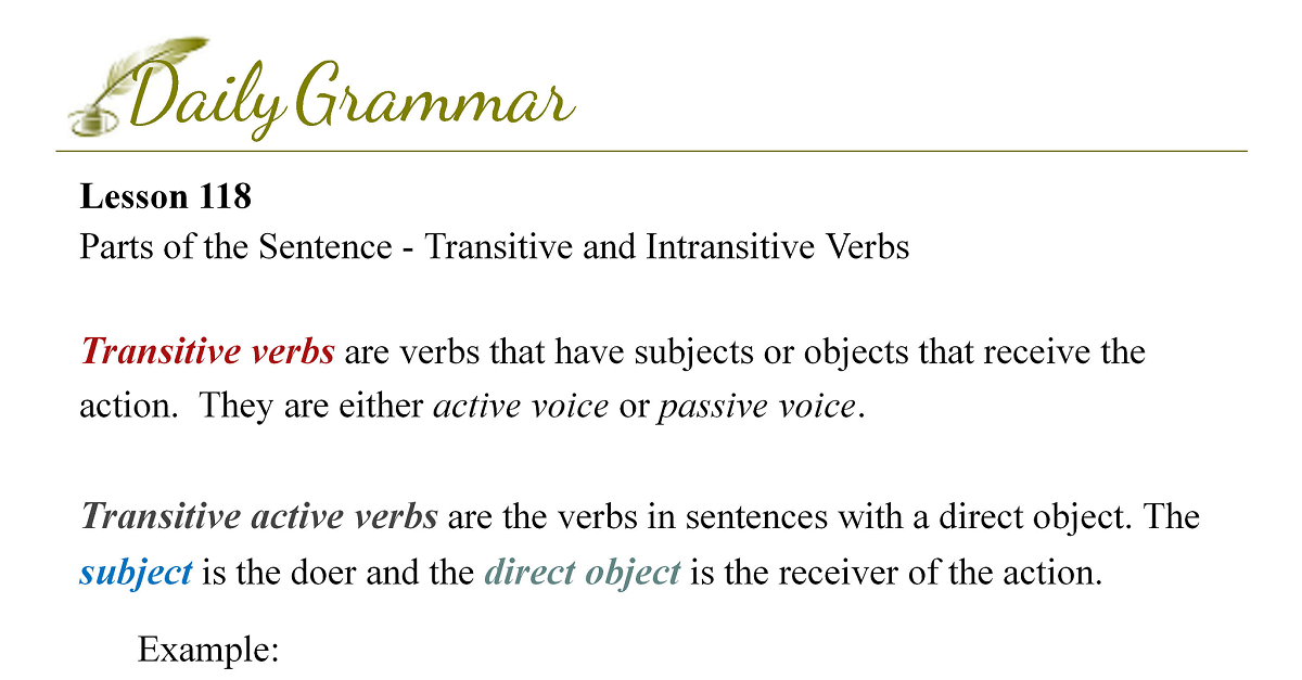 Transitive active verbs are the verbs in sentences with a direct object. The subjectThe subject tells who or what about the verb. Source: Lesson 91 is the doer and the direct objectA direct object receives the action performed by the subject. The verb used with a direct object is always an action verb. Another way of saying it is that the subject does the verb to the direct object.