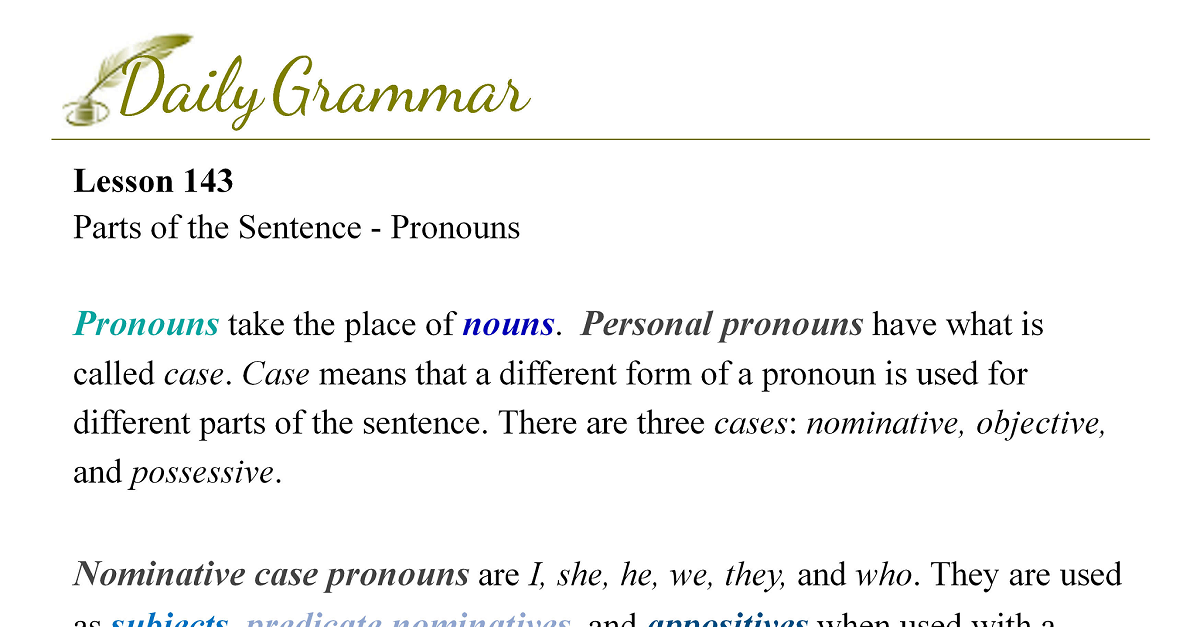 Pronouns take the place of nounsA noun is a word that names a person, place, thing, or idea. Examples: man, city, book, and courage. Source: Lesson 16. Personal pronounsPersonal pronouns refer to (1) the speaker or speakers, (2) those spoken to, or (3) those spoken about. Source: Lesson 21 have what is called case. Case means that a different form of a pronoun is used for different parts of the sentence. There are three cases: nominative, objective, and possessive.
