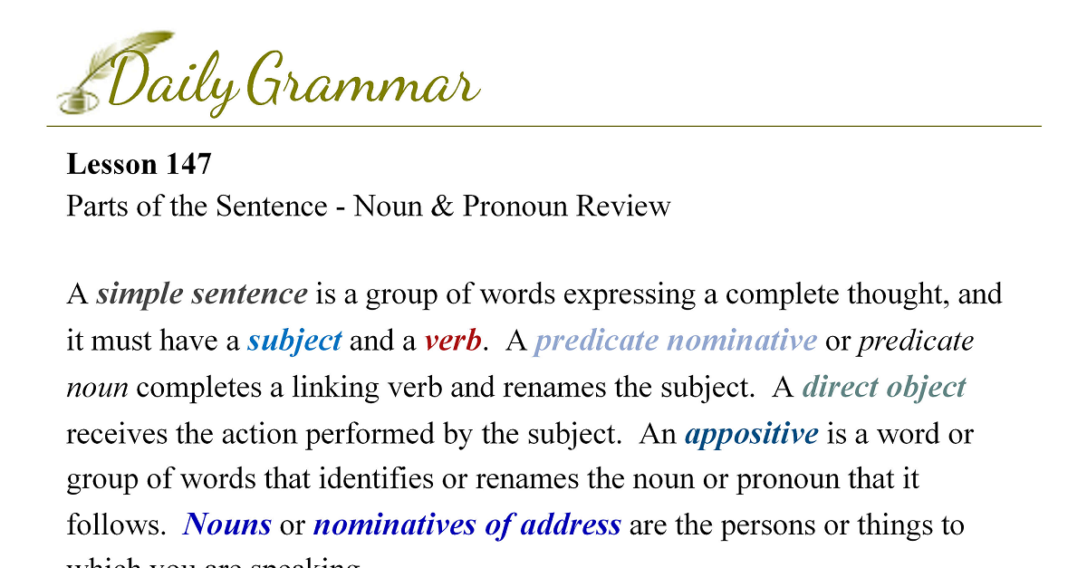 A simple sentence is a group of words expressing a complete thought, and it must have a subject and a verb. A predicate nominative or predicate noun completes a linking verb and renames the subject. A direct object receives the action performed by the subject. An appositive is a word or group of words that identifies or renames the noun or pronoun that it follows. Nouns or nominatives of address are the persons or things to which you are speaking.