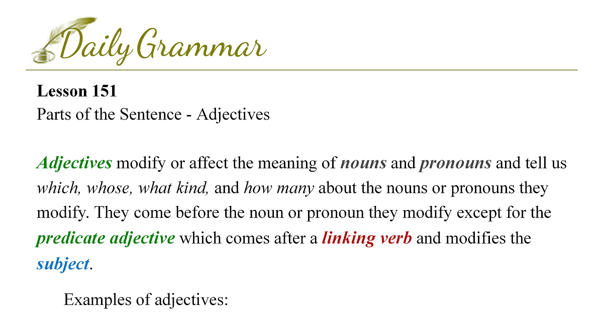 Source: Lesson 21 and tell us which, whose, what kind, and how many about the nouns or pronouns they modify. They come before the noun or pronoun they modify except for the predicate adjective which comes after a