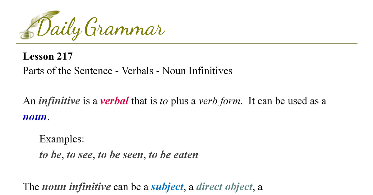 An infinitive is a verbalA verbal is a verb form used as some other part of speech. Source: Lesson 206 that is to plus a verb form. It can be used as a nounA noun is a word that names a person, place, thing, or idea. Examples: man, city, book, and courage. Source: Lesson 16.