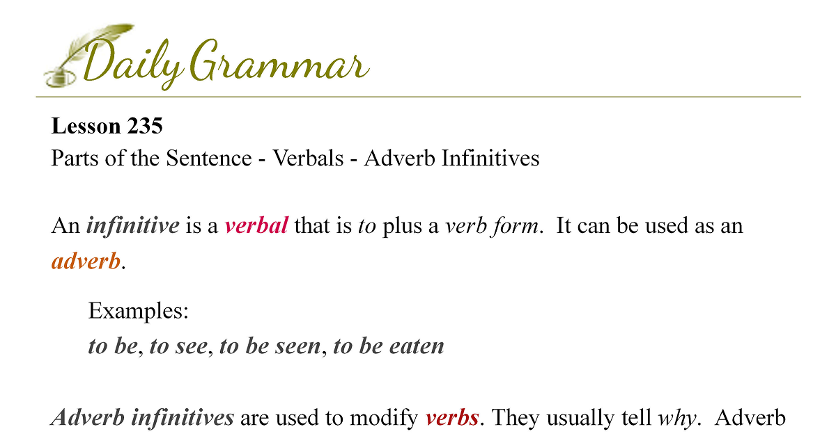 Source: Lesson 1. They usually tell why. Adverb infinitives are also used to modify predicate adjectivesAn adjective that comes after a linking verb and modifies the subject.