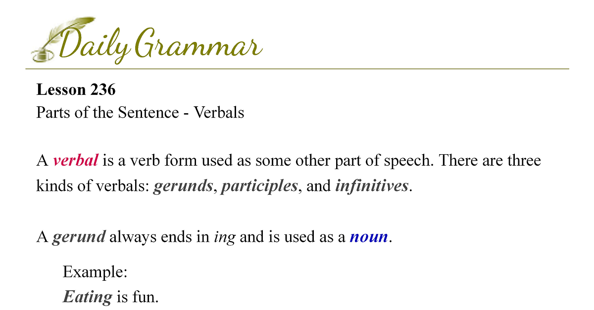A verbal is a verb form used as some other part of speech. There are three kinds of verbals: gerunds, participles, and infinitives.
