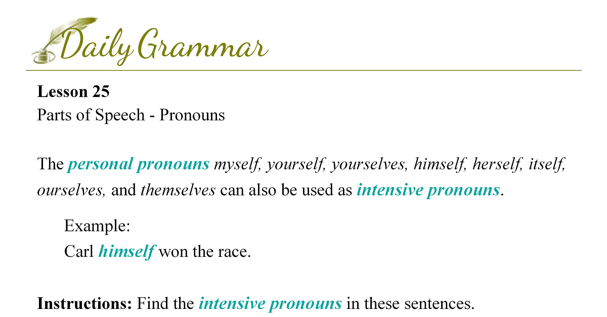 The personal pronounsPersonal pronouns refer to (1) the speaker or speakers, (2) those spoken to, or (3) those spoken about. Source: Lesson 21 myself, yourself, yourselves, himself, herself, itself, ourselves, and themselves can also be used as intensive pronouns.