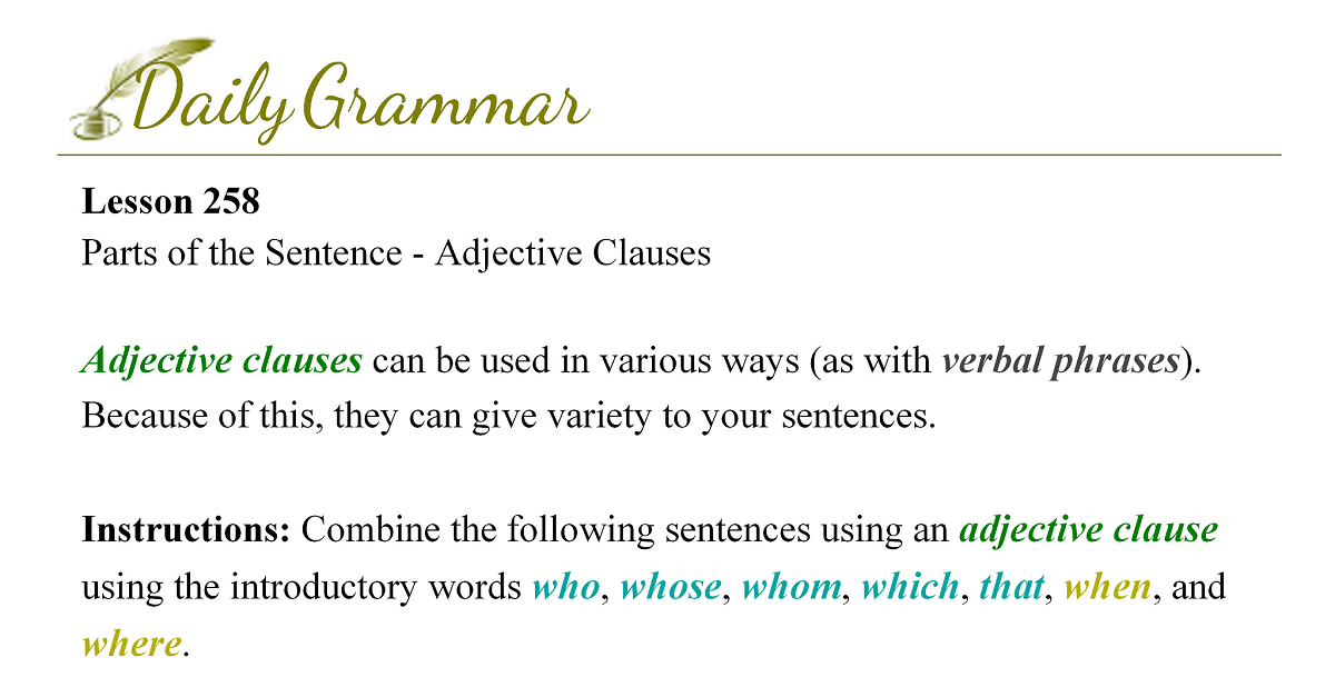 Adjective clausesThe adjective clause is a dependent clause that is used to modify a noun or a pronoun. It will begin with a relative pronoun (who, whose, whom, which, and that) or a subordinate conjunction (when and where). Those are the only words that can be used to introduce an adjective clause.