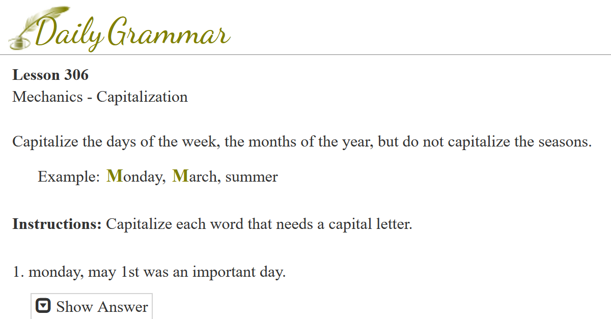 Capitalize the days of the week, the months of the year, but do not capitalize the seasons.