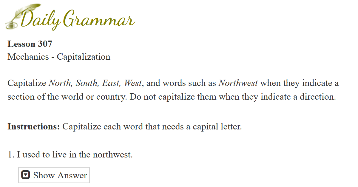 Capitalize North, South, East, West, and words such as Northwest when they indicate a section of the world or country. Do not capitalize them when they indicate a direction.