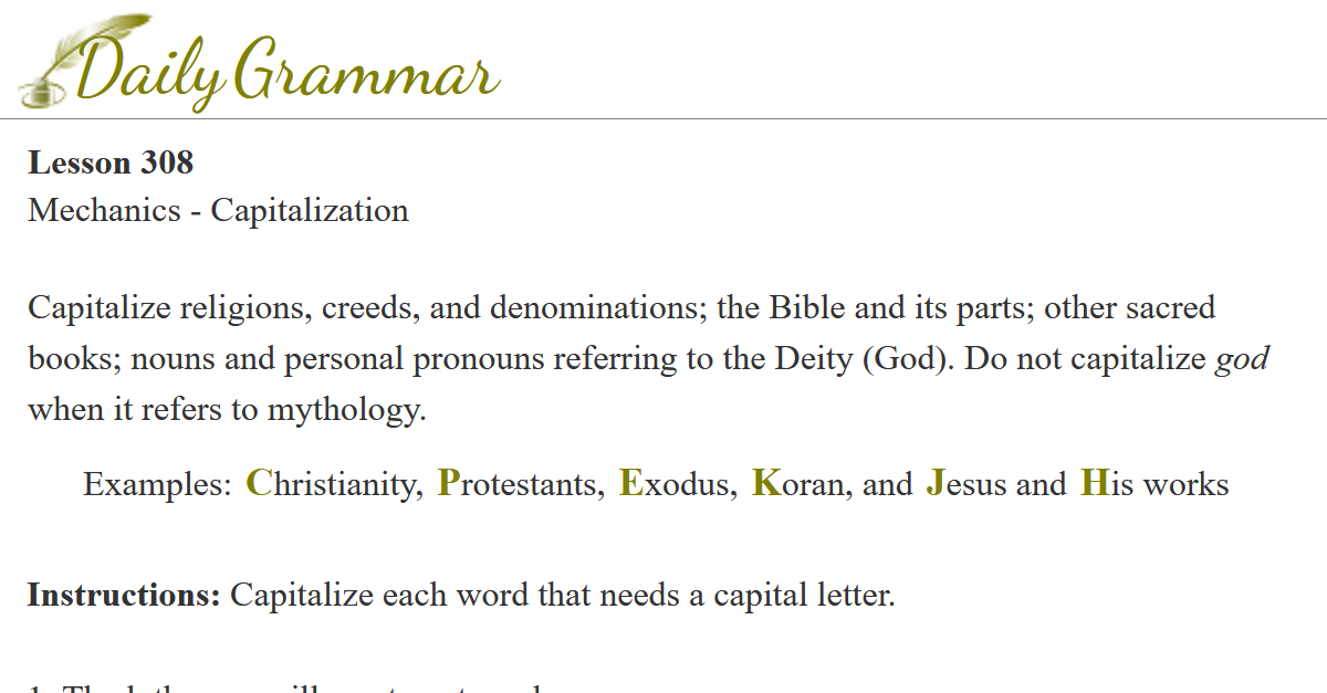Capitalize religions, creeds, and denominations; the Bible and its parts; other sacred books; nouns and personal pronouns referring to the Deity (God). Do not capitalize god when it refers to mythology.