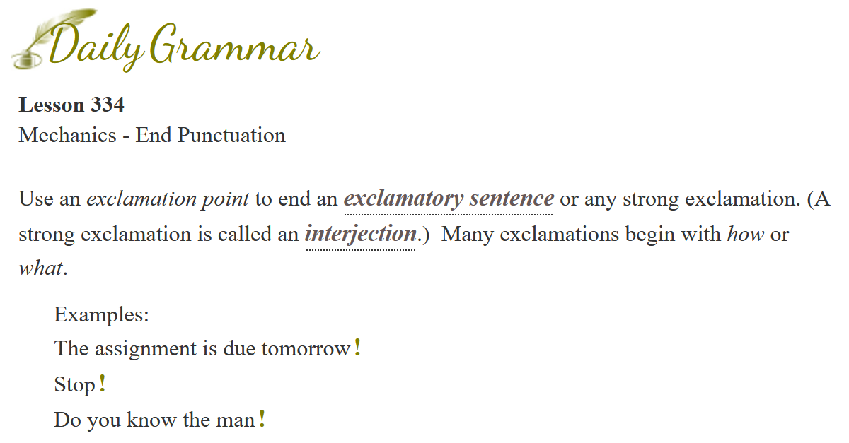 exclamation. (A strong exclamation is called an interjectionAn interjection is a word or word group that shows feeling. A mild interjection is followed by a comma; a strong interjection is followed by an exclamation mark.