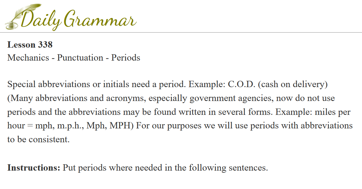 Special abbreviations or initials need a period. Example: C.O.D. (cash on delivery) (Many abbreviations and acronyms, especially government agencies, now do not use periods and the abbreviations may be found written in several forms. Example: miles per hour = mph, m.p.h., Mph, MPH) For our purposes we will use periods with abbreviations to be consistent.