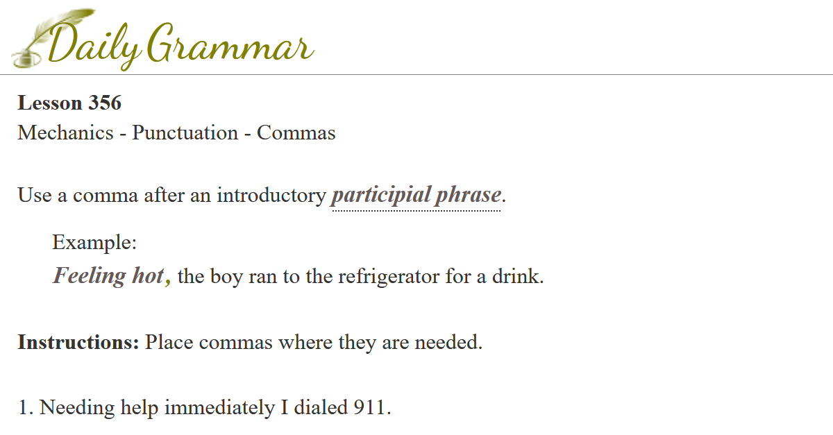 Use a comma after an introductory participial phraseA participle is a verbal used as an adjective. A participial phrase is made up of a participle and any complements.