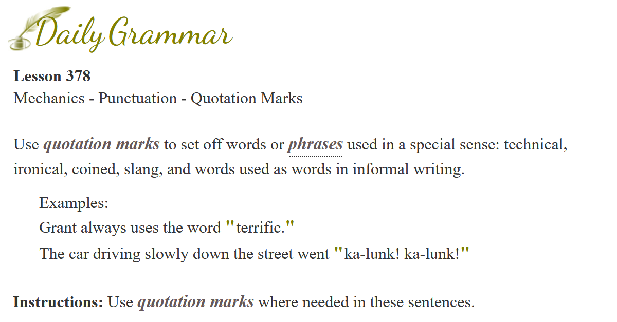 Use quotation marks to set off words or phrasesA phrase is a group of words used as a sentence part. It does not have a subject and a verb. It can be a noun, adjective, or adverb. Some common phrases are prepositional, gerund, participial, and infinitive. Source: Lesson 246 used in a special sense: technical, ironical, coined, slang, and words used as words in informal writing.