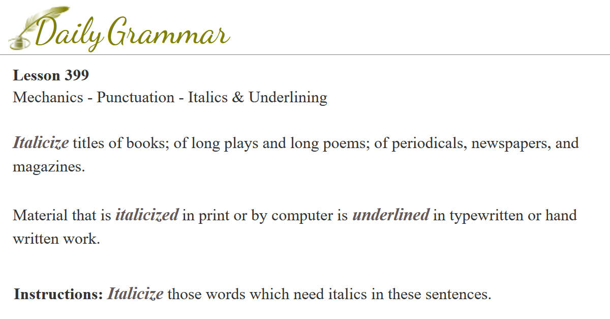 Material that is italicized in print or by computer is underlined in typewritten or hand written work.
