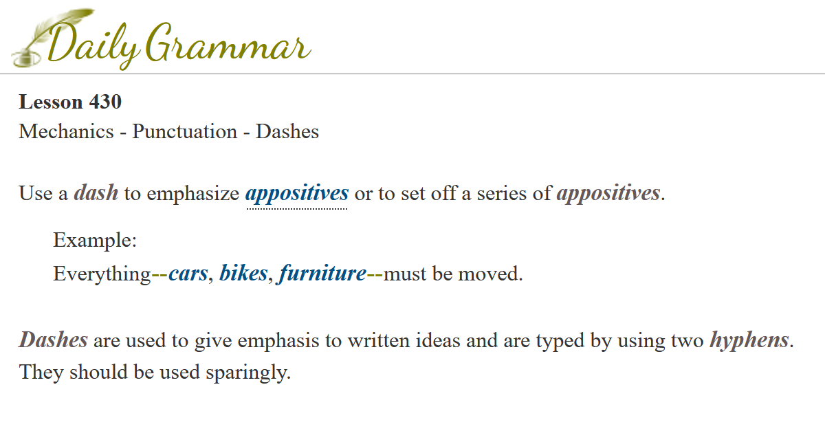 Use a dash to emphasize appositivesAn appositive is a word or group of words that identifies or renames the noun or pronoun that it follows. It is set off by commas unless closely tied to the word that it identifies or renames. ("Closely tied" means that it is needed to identify the word.) An appositive can follow any noun or pronoun. Source: Lesson 128 or to set off a series of appositives.