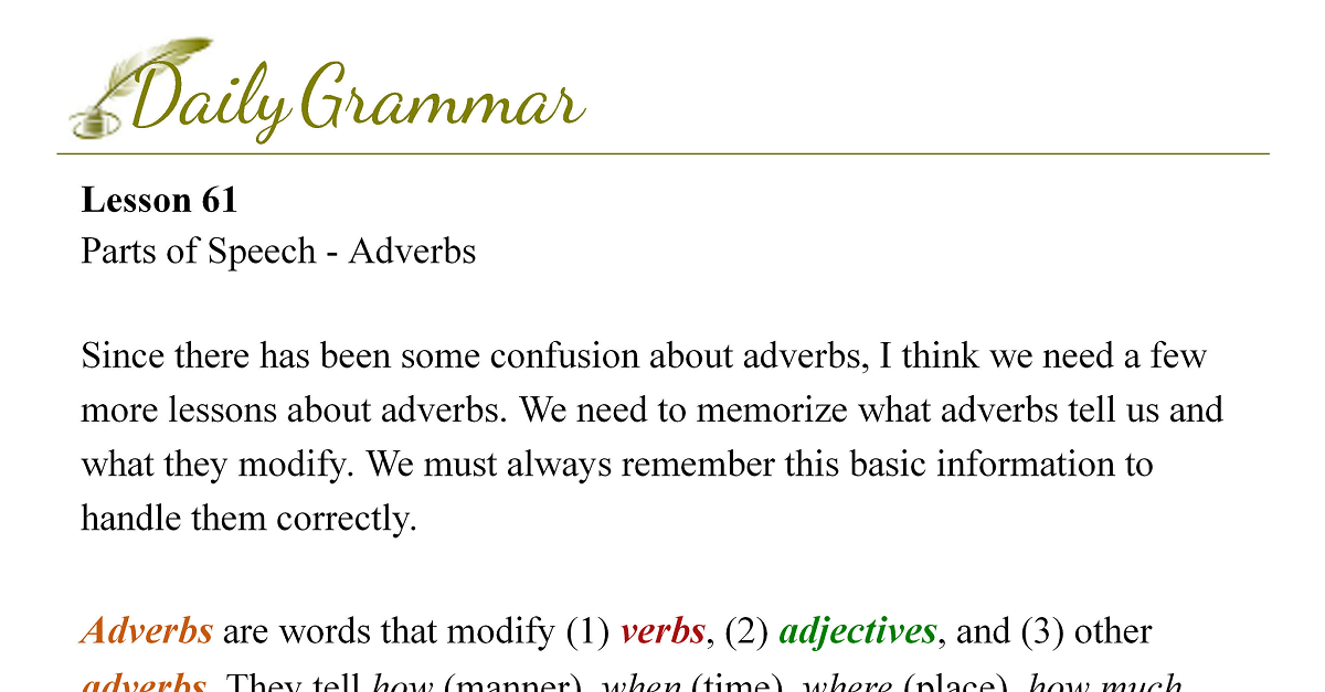 Since there has been some confusion about adverbs, I think we need a few more lessons about adverbs. We need to memorize what adverbs tell us and what they modify. We must always remember this basic information to handle them correctly.