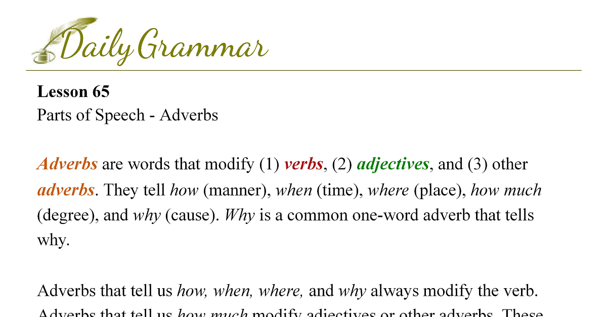Source: Lesson 31, and (3) other adverbs. They tell how (manner), when (time), where (place), how much (degree), and why (cause). Why is a common one-word adverb that tells why.