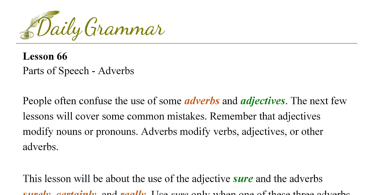 Source: Lesson 31. The next few lessons will cover some common mistakes. Remember that adjectives modify nouns or pronouns. Adverbs modify verbs, adjectives, or other adverbs.
