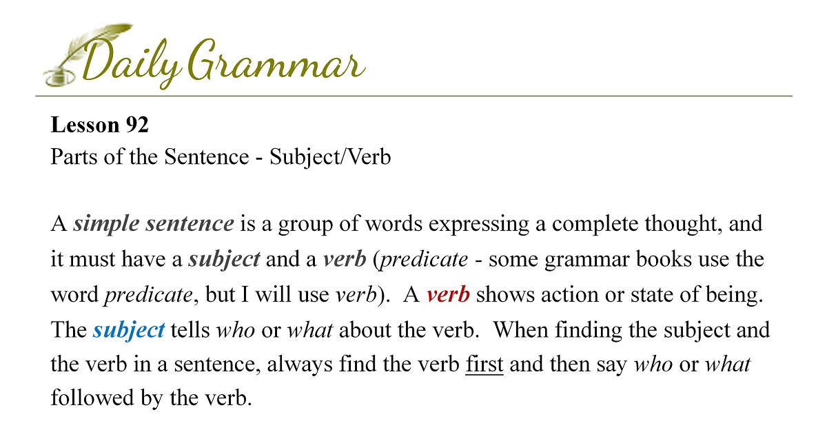 A simple sentence is a group of words expressing a complete thought, and it must have a subject and a verb (predicate - some grammar books use the word predicate, but I will use verb). A verb shows action or state of being. The subject tells who or what about the verb. When finding the subject and the verb in a sentence, always find the verb first and then say who or what followed by the verb.