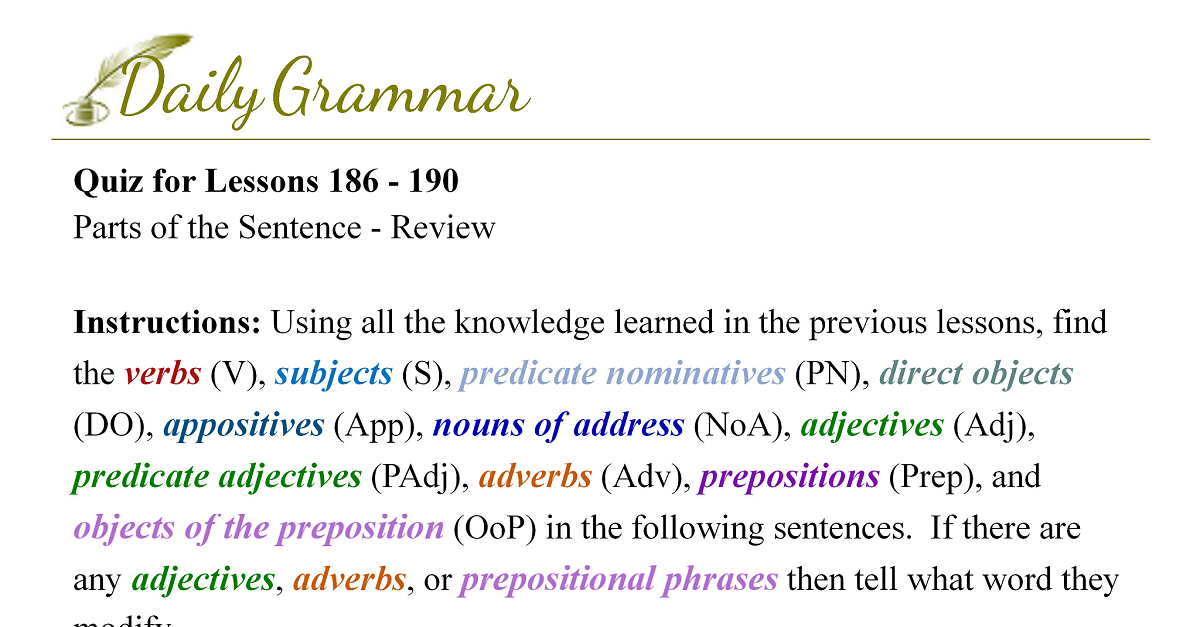 Instructions: Using all the knowledge learned in the previous lessons, find the verbs (V), subjects (S), predicate nominatives (PN), direct objects (DO), appositives (App), nouns of address (NoA), adjectives (Adj), predicate adjectives (PAdj), adverbs (Adv), prepositions (Prep), and objects of the preposition (OoP) in the following sentences. If there are any adjectives, adverbs, or prepositional phrases then tell what word they modify.