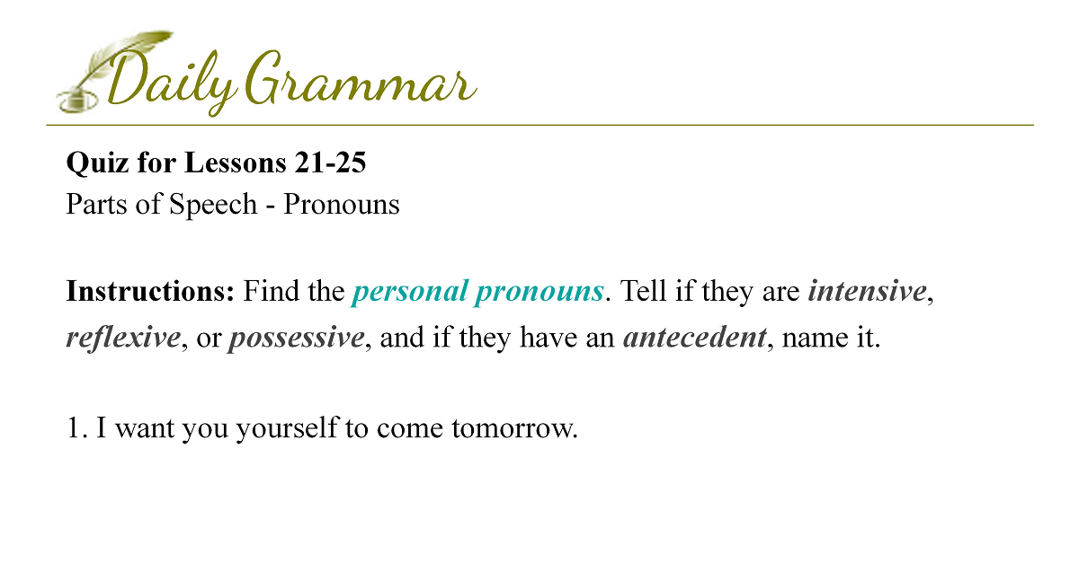 Instructions: Find the personal pronouns. Tell if they are intensive, reflexive, or possessive, and if they have an antecedent, name it.