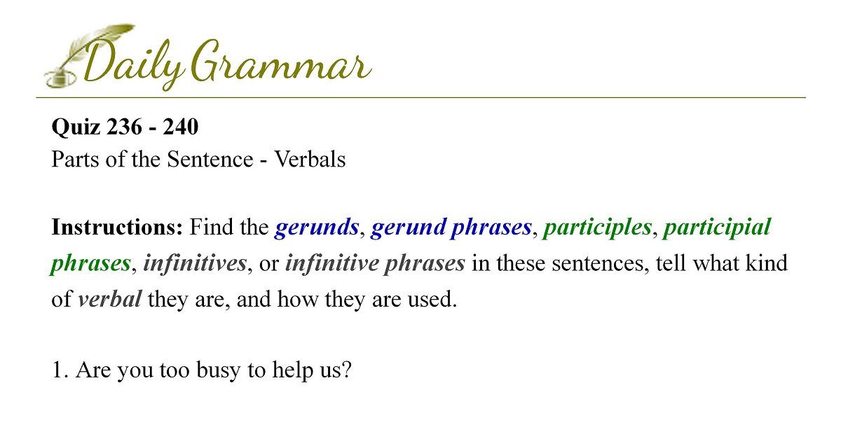 Instructions: Find the gerunds, gerund phrases, participles, participial phrases, infinitives, or infinitive phrases in these sentences, tell what kind of verbal they are, and how they are used.