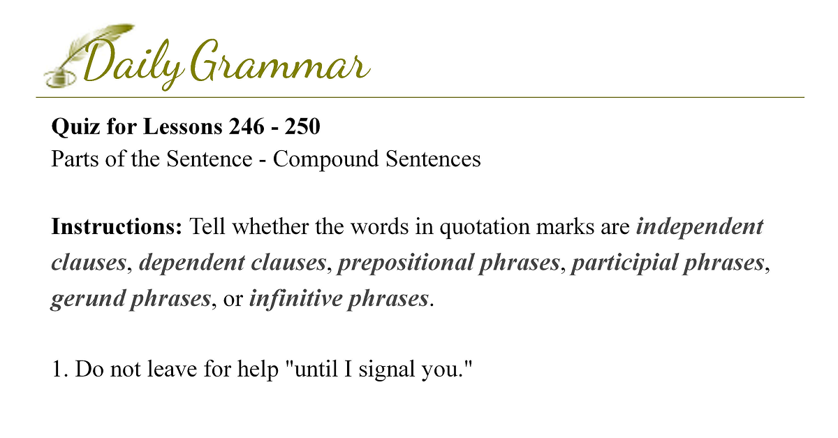 Instructions: Tell whether the words in quotation marks are independent clauses, dependent clauses, prepositional phrases, participial phrases, gerund phrases, or infinitive phrases.