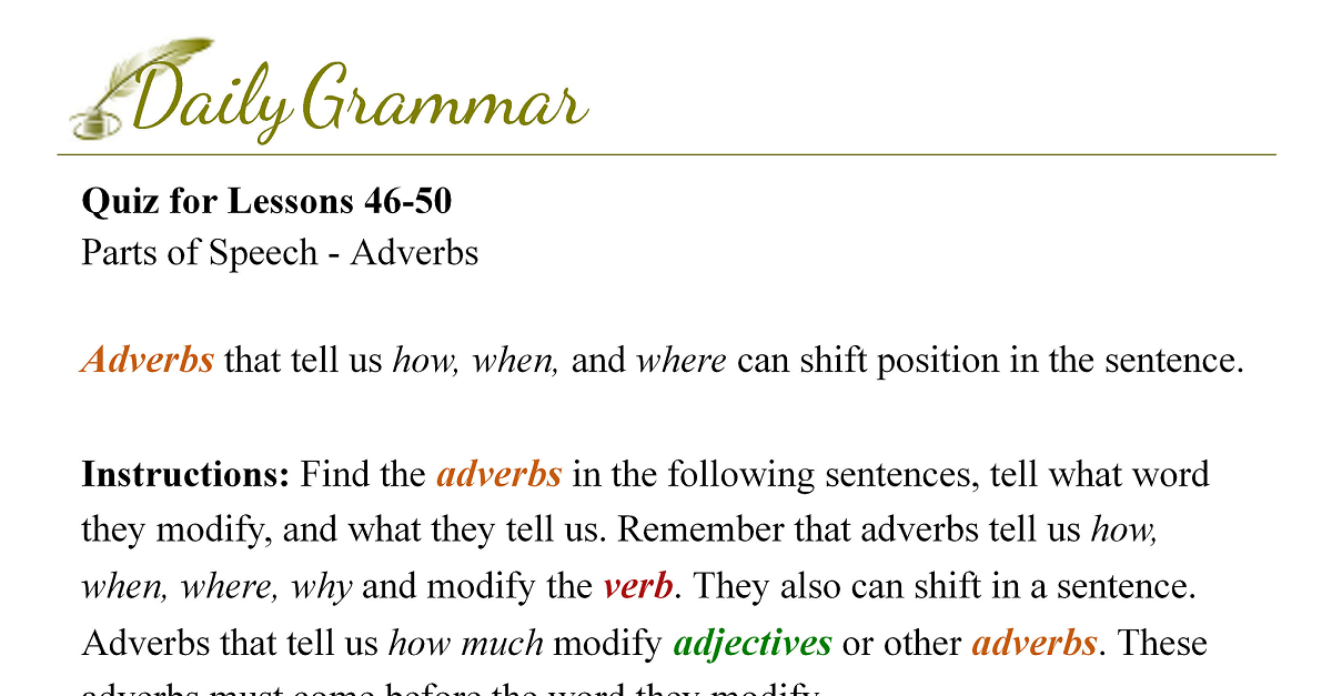 Instructions: Find the adverbs in the following sentences, tell what word they modify, and what they tell us. Remember that adverbs tell us how, when, where, why and modify the verb. They also can shift in a sentence. Adverbs that tell us how much modify adjectives or other adverbs. These adverbs must come before the word they modify.