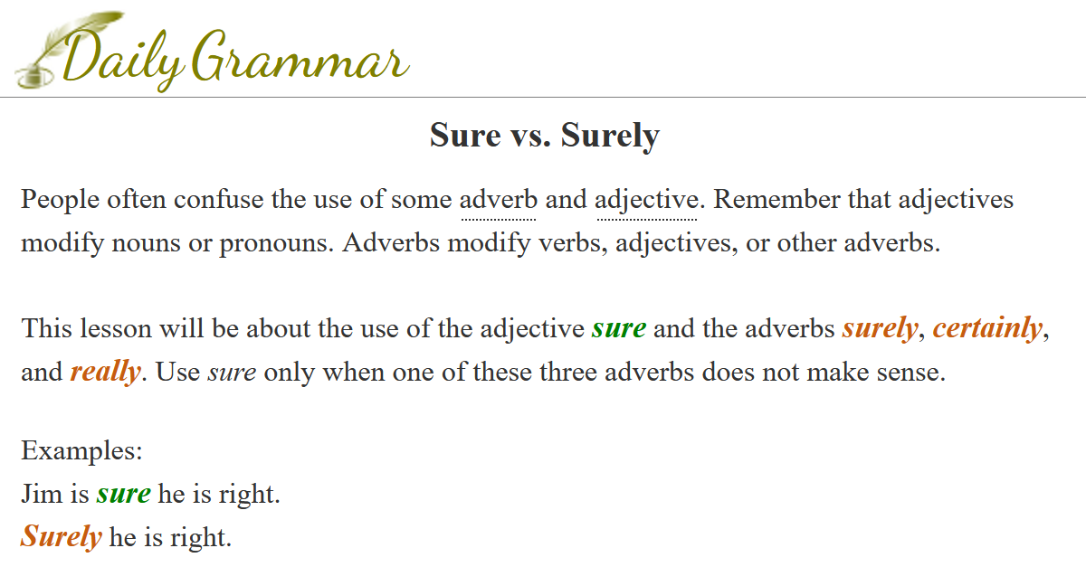 This lesson will be about the use of the adjective sure and the adverbs surely, certainly, and really. Use sure only when one of these three adverbs does not make sense.